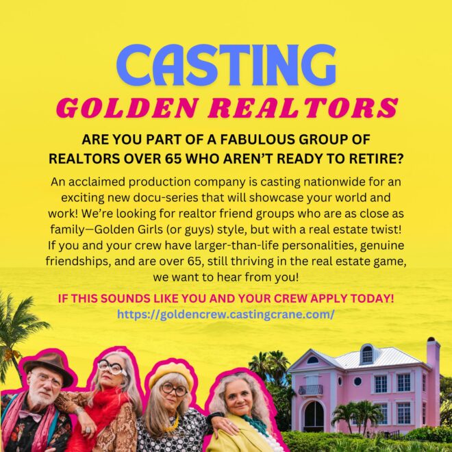 An acclaimed production company is casting nationwide for an exciting new docu-series that will showcase your world and work! We’re looking for realtor friend groups who are as close as family-Golden Girls (or guys) style, but with a real estate twist! If you and your crew have larger-than-life personalities, genuine friendships, and are over 65, still thriving in the real estate game, we want to hear from you!