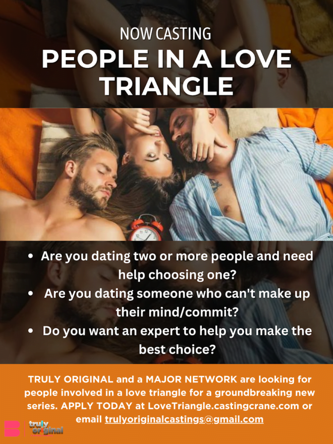 TRULY ORIGINAL and a MAJOR NETWORK are looking for people involved in a love triangle for a groundbreaking new series.