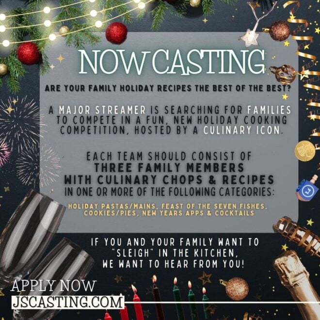 Casting directors for a Christmas and holiday cooking series are looking for cooks who can “Sleigh the kitchen.” Holiday cooking show is seeking families who cook together who can put together a team of at least 3 family members and have family recipes that they believe will wow the judges. This cooking series is currently taking online auditions from families nationwide and has a form that interested families can fill out online and send in as their application.