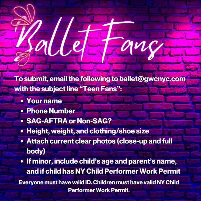 Ballet Fan Submission: To apply, email the following information to ballet@gwcnyc.com with the subject line “Teen Fans”: