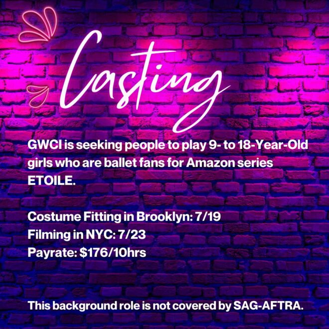 GWC is casting girls to portray ballet fans for a new Amazon project, currently named “Etoile” – filming in the New York City area.