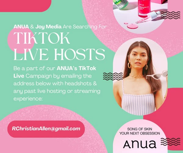 We’re looking for dynamic Hosts and Co-Hosts for an exciting upcoming TikTok Live campaign with ANUA Skincare! This is a PAID opportunity for local talent in the LA area.