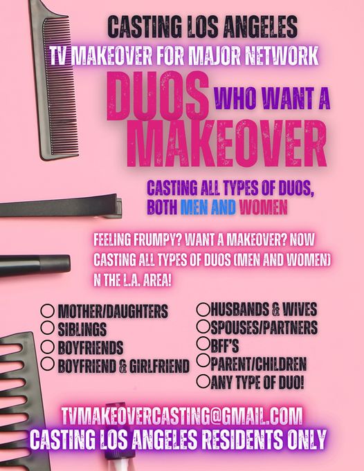 To apply, please email tvmakeovercasting@gmail.com with recent photos of both of you, your phone and email contact information, names and ages of both individuals, and a brief description of why you’re in need of a makeover.