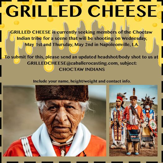 “GRILLED CHEESE”, the new movie by Ryan Coogler (Black Panther, Creed franchise) and Michael B. Jordan(Black Panther, Creed franchise) is currently looking for some members of the Choctaw Indian Tribe to work with us for a scene on both Wednesday, May 1st and Thursday, May 2nd.