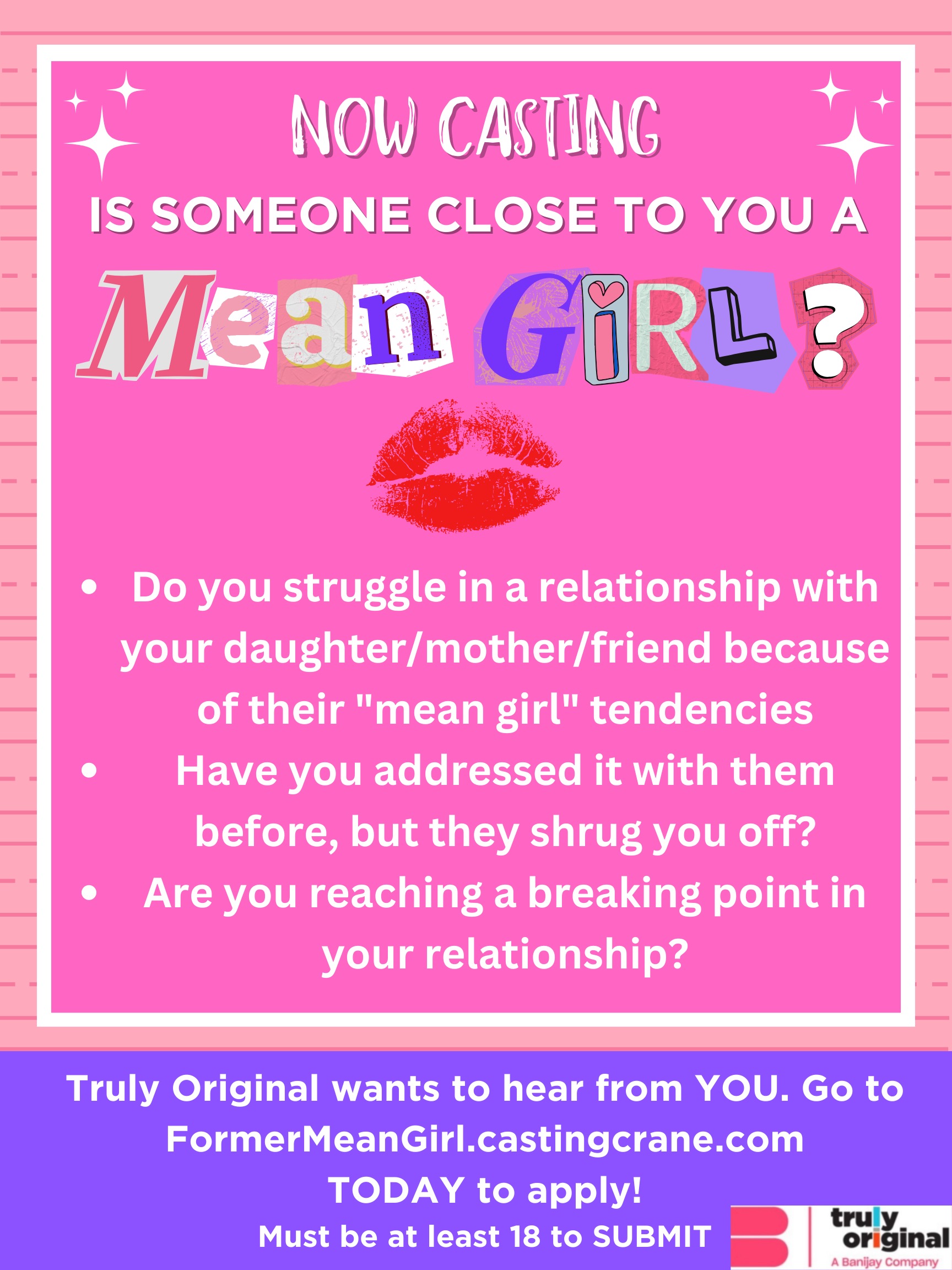 Truly Original wants to hear from you! Apply/Nominate a mean girl at formermeangirl.castingcrane.com