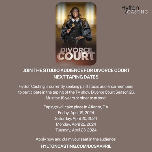 Hylton Casting is currently seeking paid studio audience members to participate in the taping of the TV show DIVORCE COURT – SEASON 26 in Atlanta, GA.