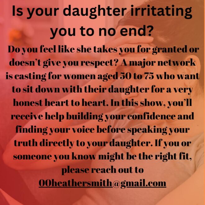 Do you feel taken for granted or disrespected by your daughter? This major network show seeks women aged 50 to 75 who are prepared to have an open and honest heart-to-heart with their daughters. Participants will receive help in building confidence and articulating their feelings before confronting their daughters.