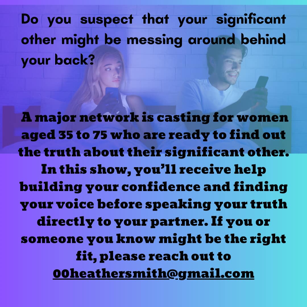 Are you worried that your partner might be unfaithful? A major network is casting women aged 35 to 75 who want to uncover the truth about their relationship. The show offers support in building confidence and finding your voice, leading up to a candid discussion with your significant other.