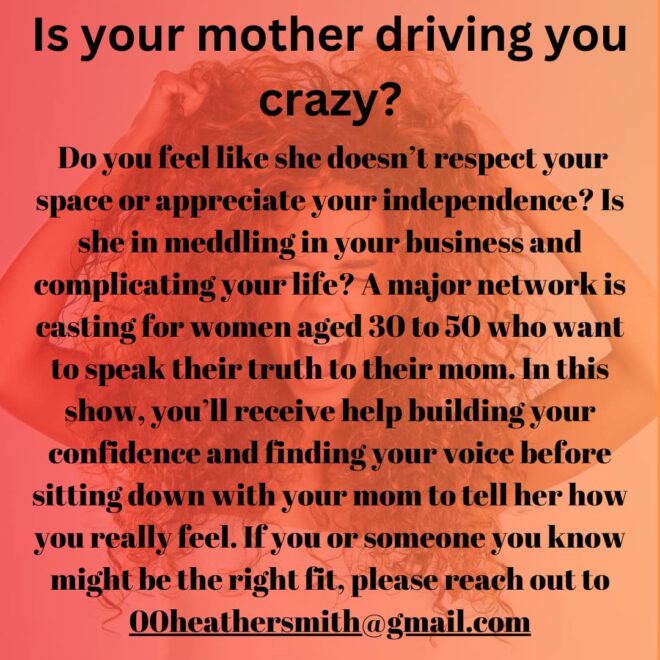 Does it feel like your mom doesn’t respect your space or appreciate your independence? Is she meddling in your business and complicating your life? A major network is looking for women aged 30 to 50 who are ready to candidly address these issues with their mothers. This show will help you build confidence and find your voice before having an honest conversation with your mom.