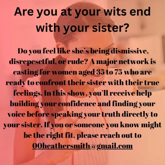 Does your sister seem dismissive, disrespectful, or rude? A major network is casting women aged 35 to 75 who are ready to express their true feelings to their sisters. This show provides guidance in building confidence and finding your voice before a frank conversation with your sister.