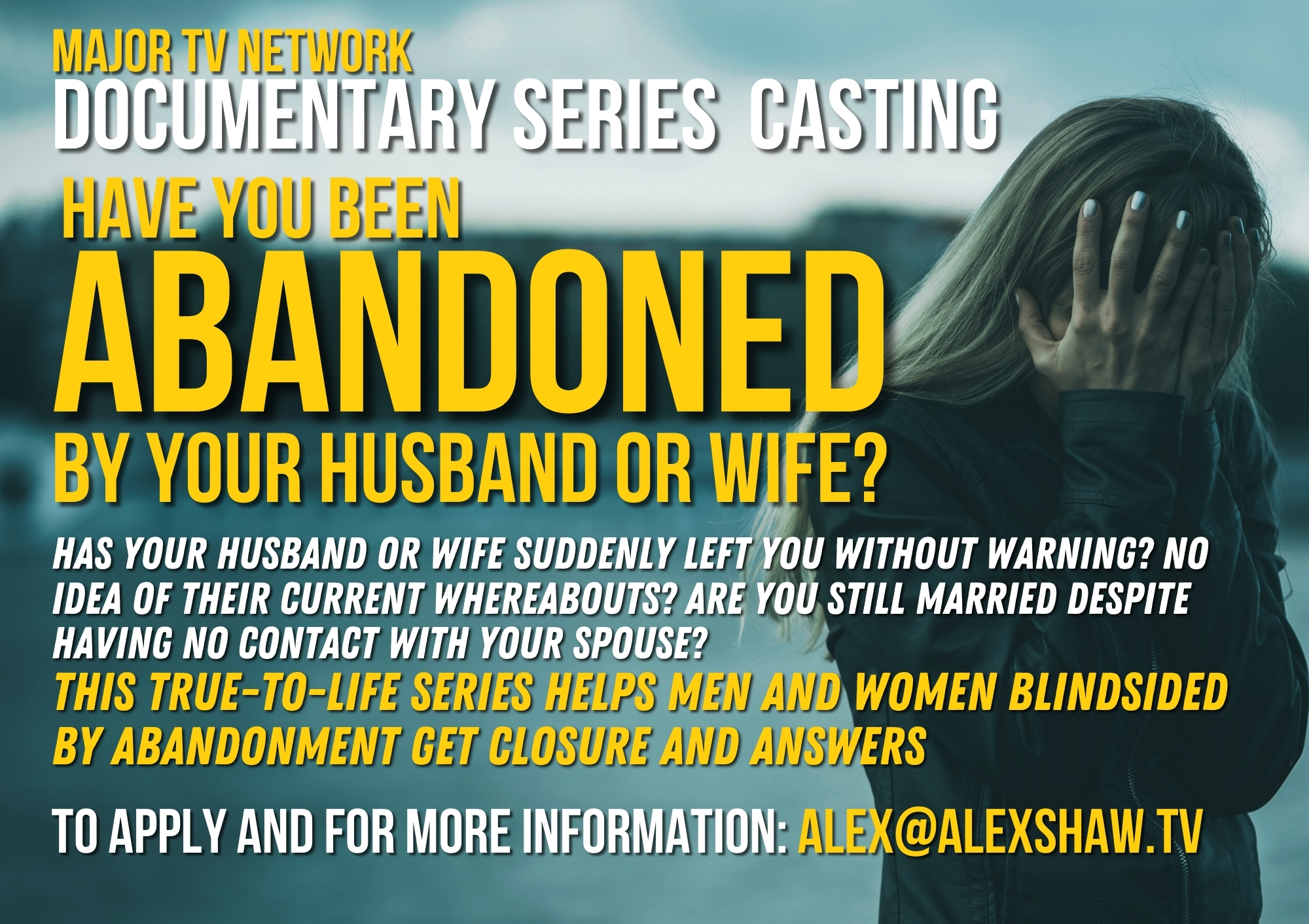Nationwide casting! Casting a documentary series for a major TV network about marital abandonment. I’m looking for married people who’s husband or wife unexpectedly left/abandoned/deserted the marriage and the other spouse has no idea where they went, where they are and has not been in touch. The series tells their story and helps them make contact to get the answers and closure that they deserve.