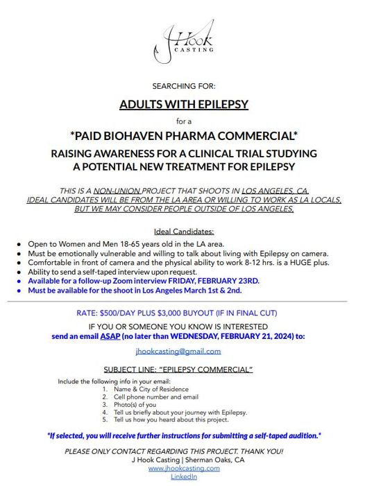 Hook Casting is currently seeking adults with epilepsy for a paid commercial by Biohaven Pharma, aimed at raising awareness for a clinical trial studying a potential new treatment for epilepsy. This non-union project shoots in Los Angeles, California, and ideal candidates will be from the LA area or willing to work as LA locals, although consideration may be given to individuals outside of Los Angeles.