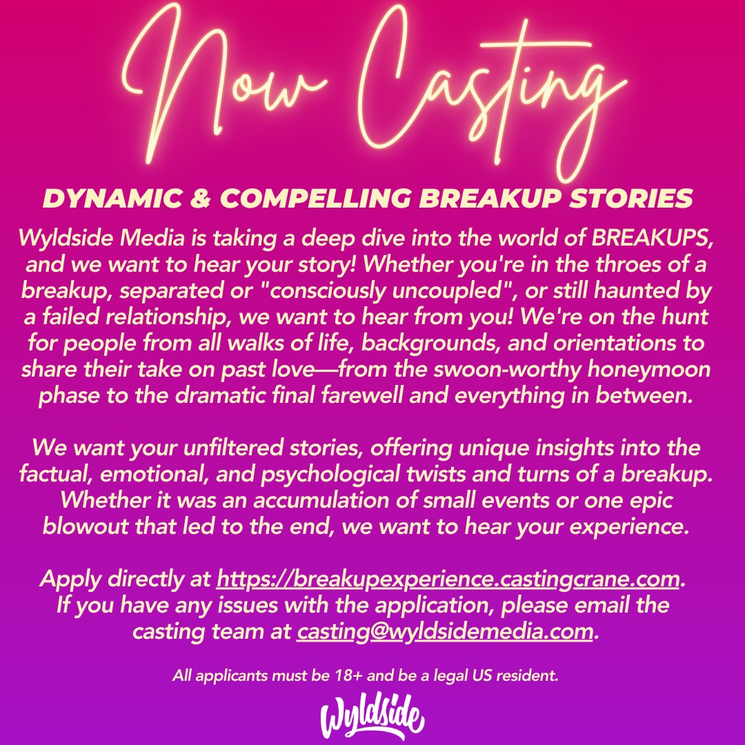 Wyldside Media is taking a deep dive into the world of BREAKUPS, and we want to hear your story! Whether you’re in the throes of a breakup, separated or “consciously uncoupled”, or still haunted by a failed relationship, we want to hear from you! We’re on the hunt for people from all walks of life, backgrounds, and orientations to share their take on past love—from the swoon-worthy honeymoon phase to the dramatic final farewell and everything in between.