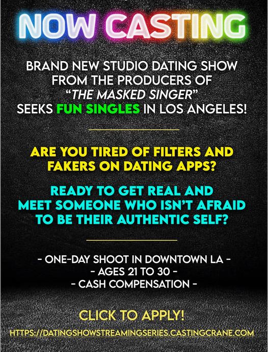Tired of swiping through filters and fakers on dating apps? Ready to meet someone real? This is your chance to find a genuine connection! From the producers of The Masked Singer comes an exciting, brand-new dating show set to film right in the heart of Los Angeles, and they’re looking for singles like you!