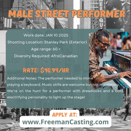 A production is currently seeking a male street performer for an upcoming project set to film in Stanley Park. The team is looking for a performer who can bring bold energy and an electrifying presence to the role.