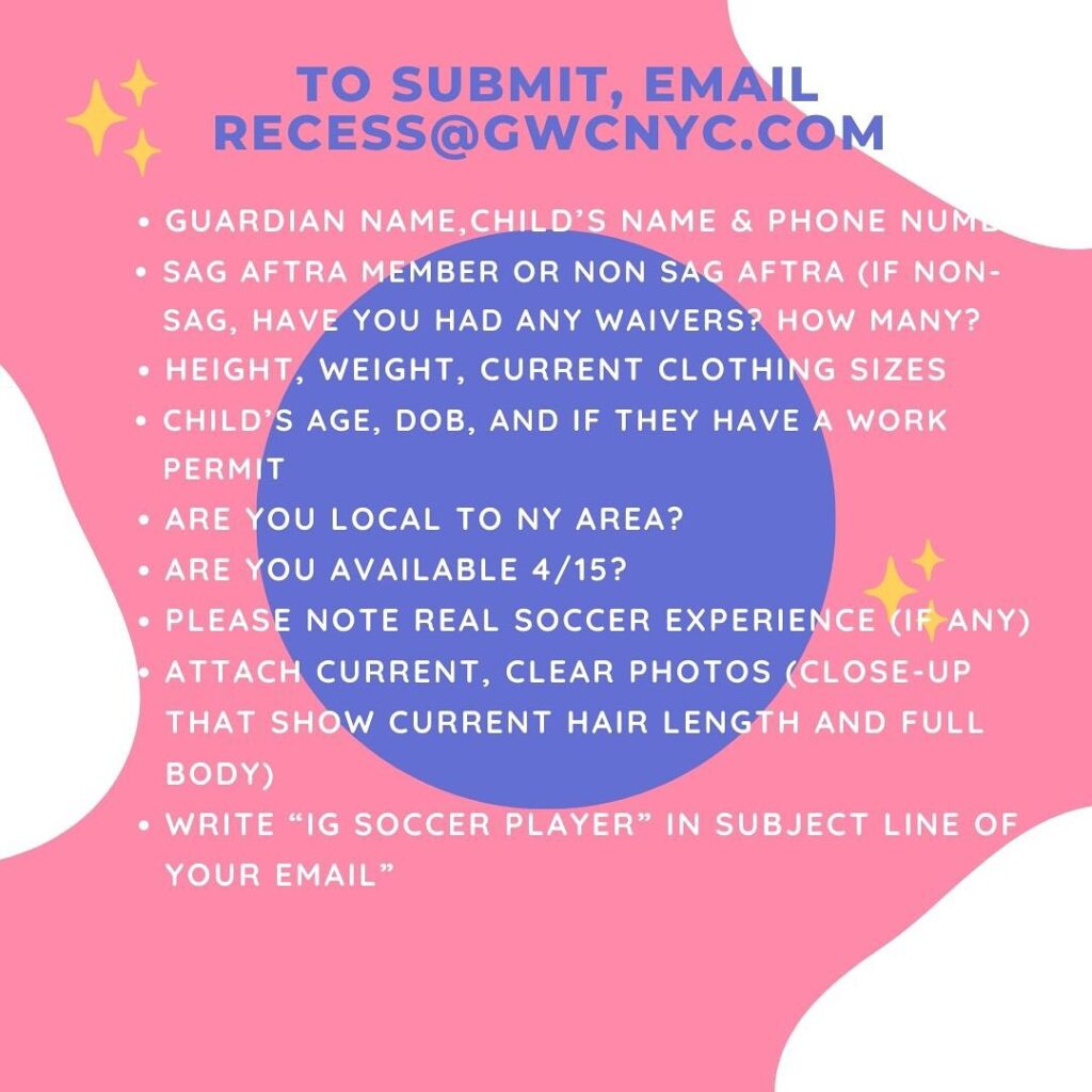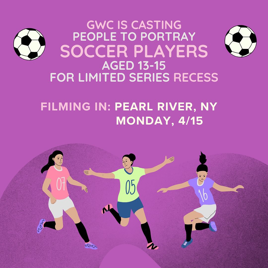 GWC is casting people to portray soccer players aged 13-15 for limited series Recess.