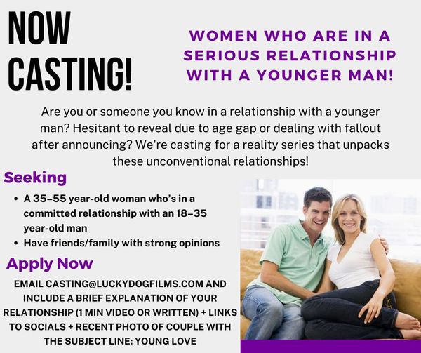 Are you or someone you know in a relationship with a younger man? Hesitant to reveal due to age gap or dealing with fallout after announcing? We’re casting for a reality series that unpacks these unconventional relationships!