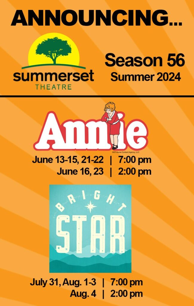 Summerset Theatre is opening up its 56th Season and will be featuring the beloved classics “Annie” and “Bright Star.” Auditions will be held on Friday, April 12, with sessions for kids aged 8-16 starting at 6 p.m., followed by auditions for adults from 7:30-9 p.m. Additional audition slots will be available on Saturday, April 13, with sessions for kids (Annie only) at 9 a.m. and for adults (Annie and Bright Star) at 10:30 a.m.