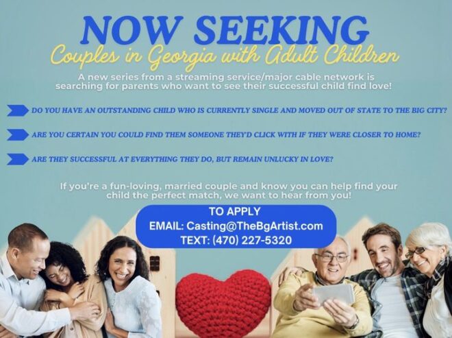 A major streaming service/cable network is casting for an innovative new series! We’re on the hunt for dynamic, fun-loving parents in Georgia who believe they can help their accomplished yet single adult child find love.