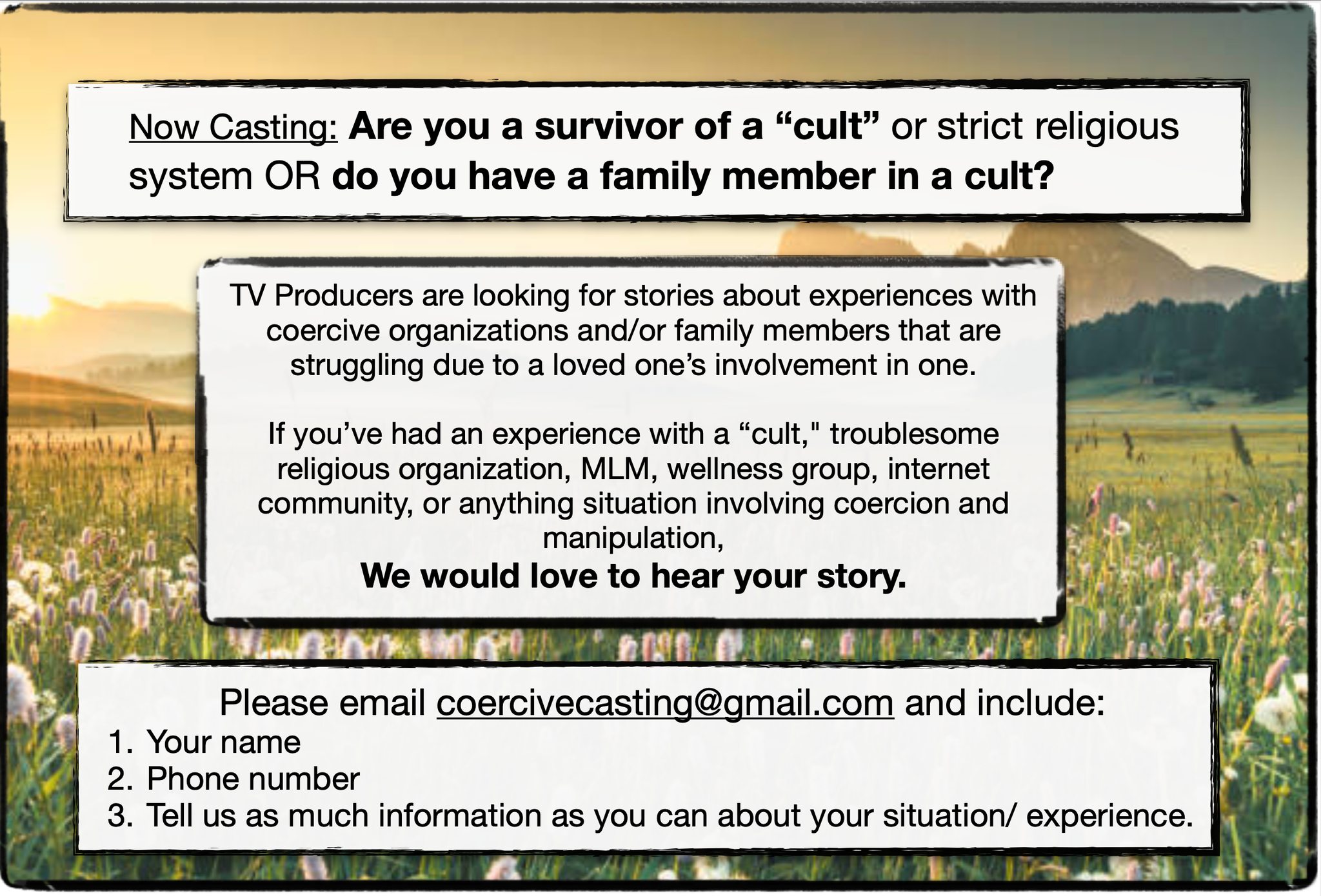 TV Producers are looking for stories about experiences with coercive organizations and/or family members that are struggling due to a loved one’s involvement in one.