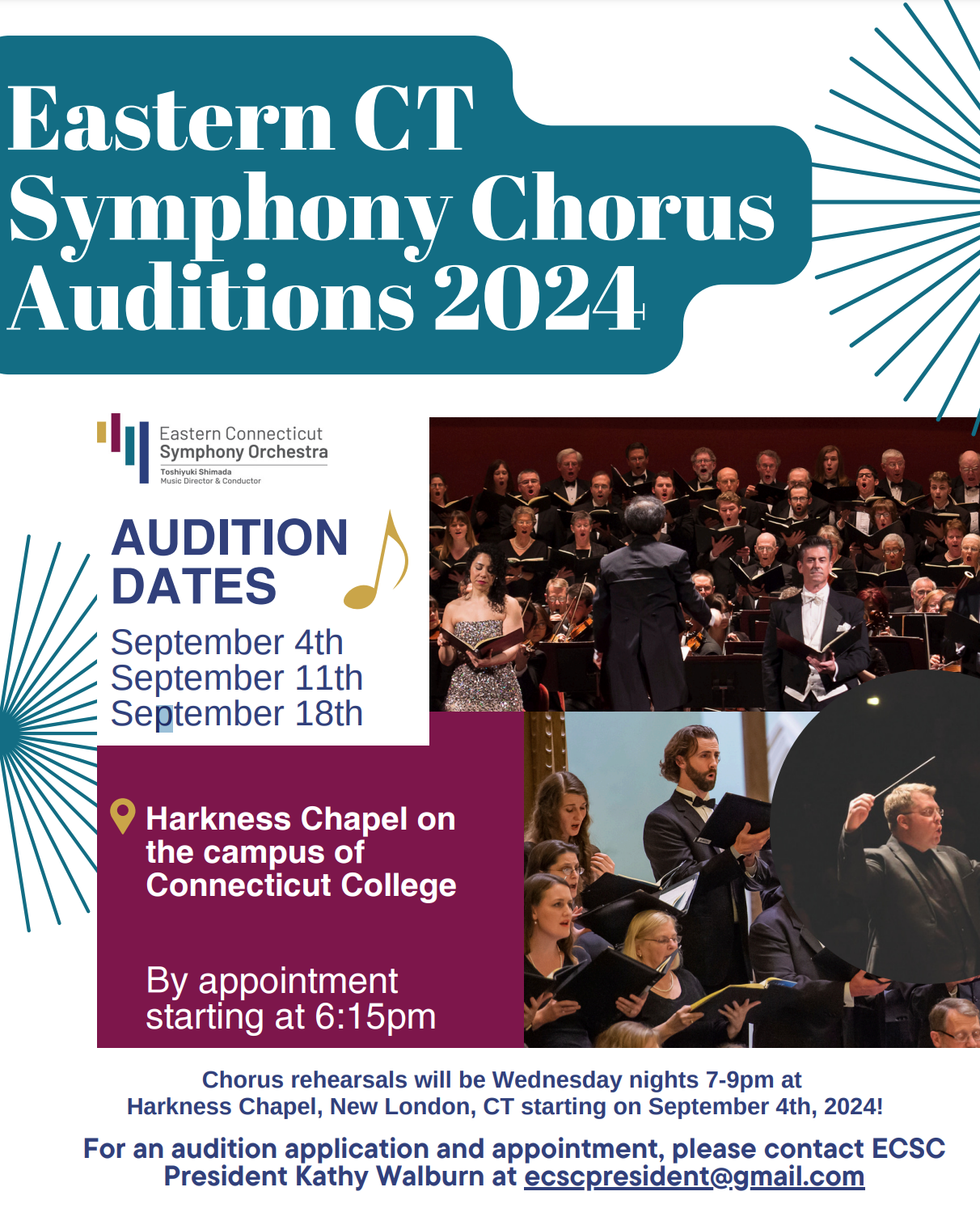 Ever consider joining us for the2024-2025 season? However, The Eastern Connecticut Symphony Chorus also has an audition coming up today, for anyone that can make it. If no, no worries as 2 more dates are coming up to singers that would like to join the professional chorus group. Auditions will be held on September 11th, and 18th 2024 at Harkness Chapel on the campus of Connecticut College.