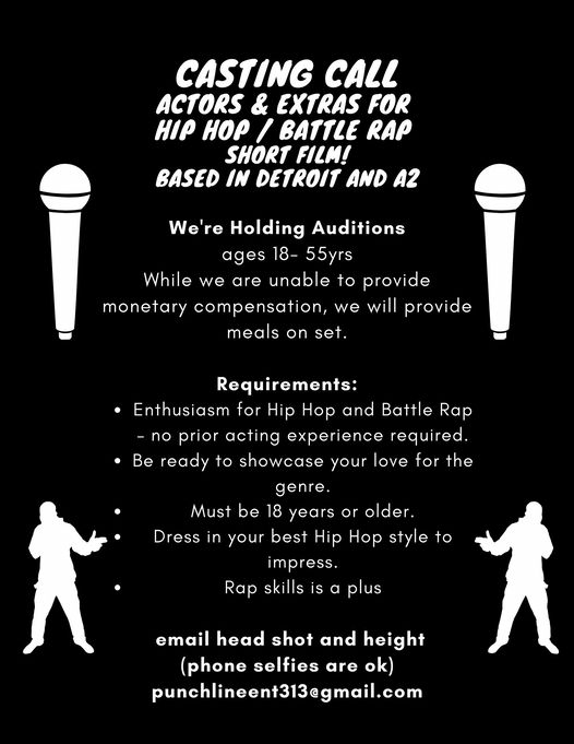 Are you passionate about Hip Hop and Battle Rap? Join us for an exciting short film project based in Detroit and Ann Arbor (A2)! We’re looking for enthusiastic individuals aged 18-55 to audition for various roles.
