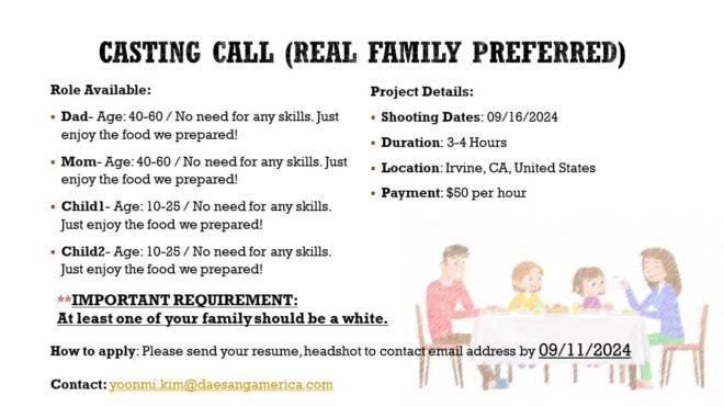 Casting Call for Actors and Families to be in a Korean food promo – Paid project.