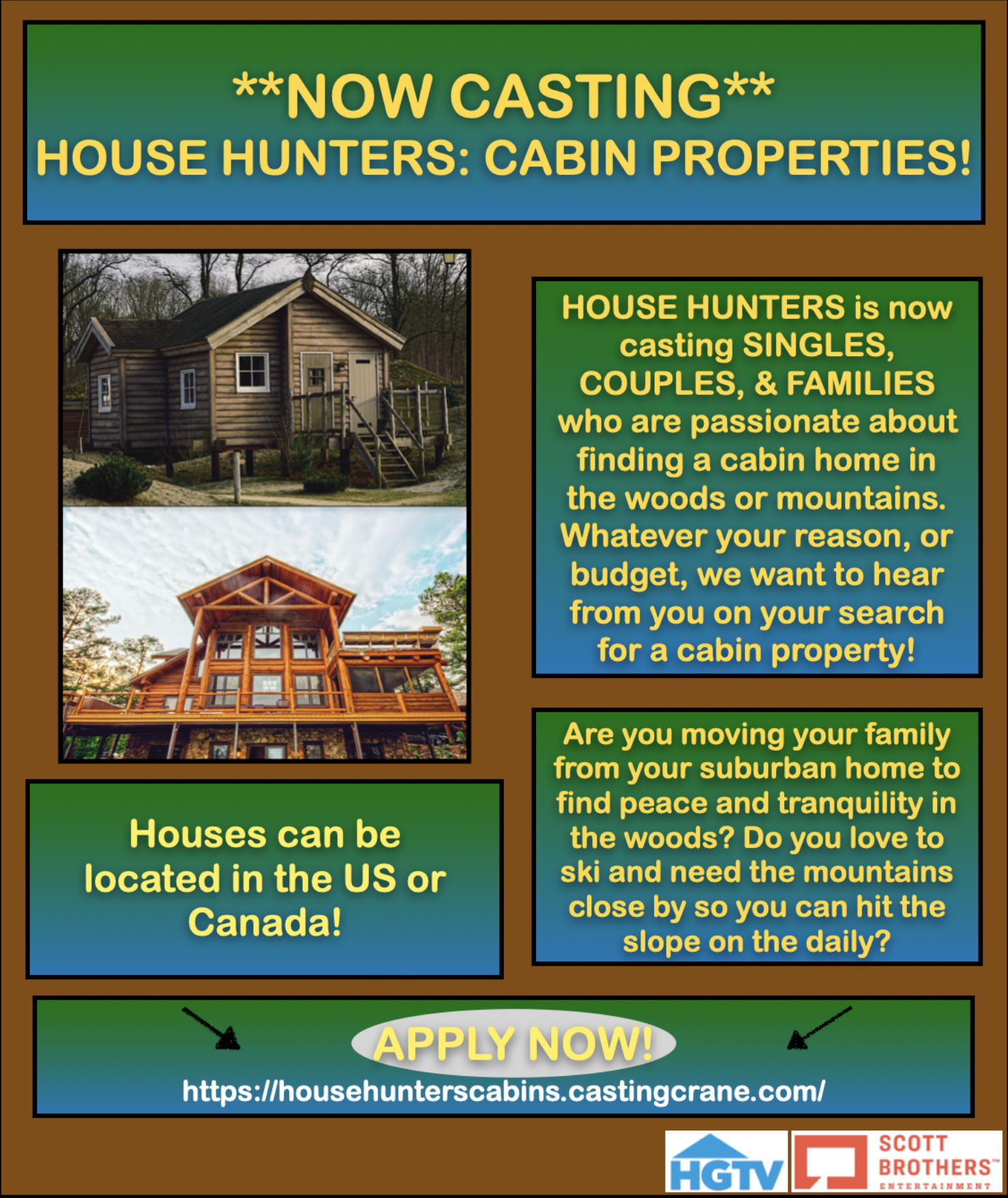 House Hunters offers a look into the world of real estate, showcasing the journey of individuals, couples, and families as they search for their dream home. The show is currently casting families that are searching for the perfect cabin property.