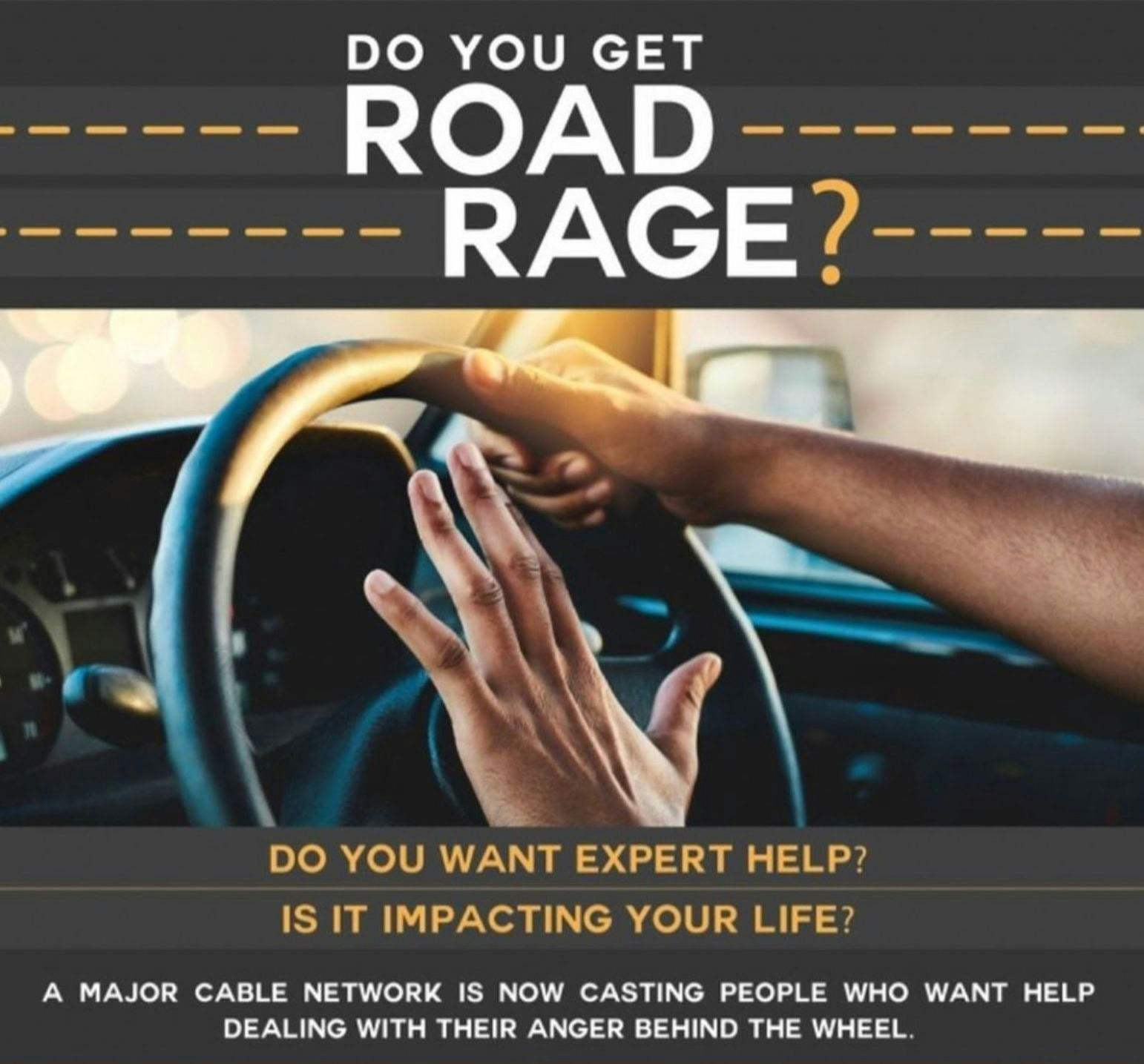 PAID OPPORTUNITY: A MAJOR CABLE NETWORK IS LOOKING FOR PEOPLE WITH ROAD RAGE WHO NEED HELP KICKING THEIR ANGER BEHIND THE WHEEL!