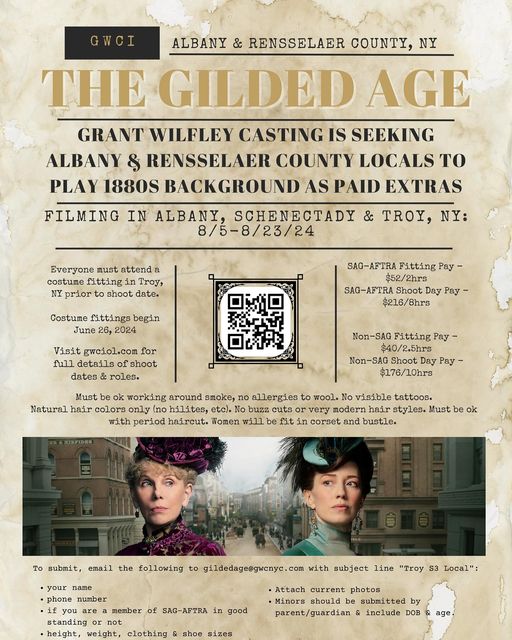 Grant Wilfley Casting is looking for Albany and Rensselaer County locals to appear as paid extras in the HBO series “The Gilded Age.” Filming will take place in Albany, Schenectady, and Troy, NY, from August 5 to August 23, 2024.