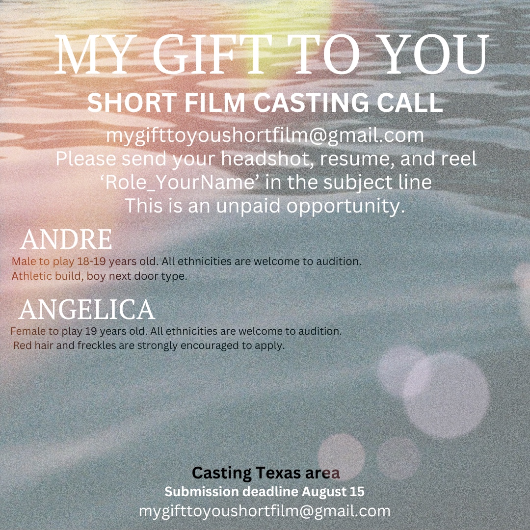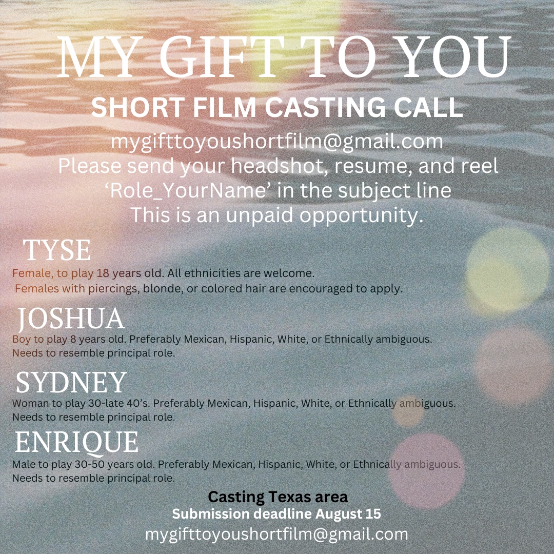 To Submit: Please send an email with your headshot, resume, and reel (if available) to mygifttoyoushortfilm@gmail.com. Include in the subject line “YOUR NAME_ROLE you are applying for” and state your location in the email.