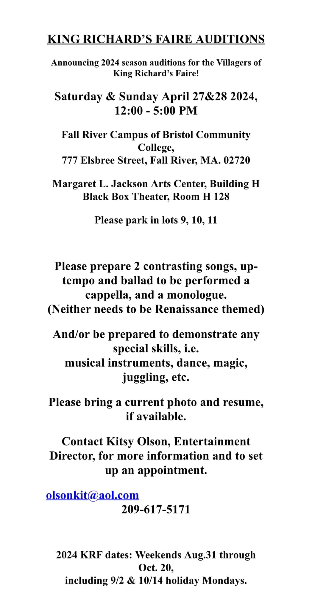 Announcing 2024 season auditions for the Villagers of King Richard’s Faire!