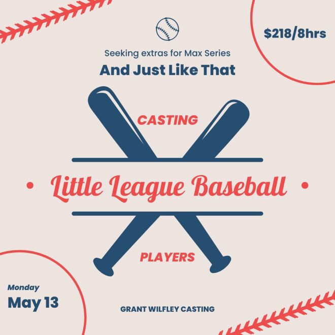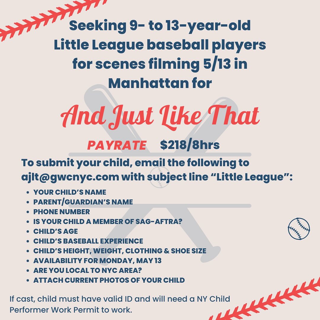 Seeking 9- to 13-year-old Little League Baseball players for scenes filming on 5/13 in Manhattan for an episode of Max series And Just Like That.