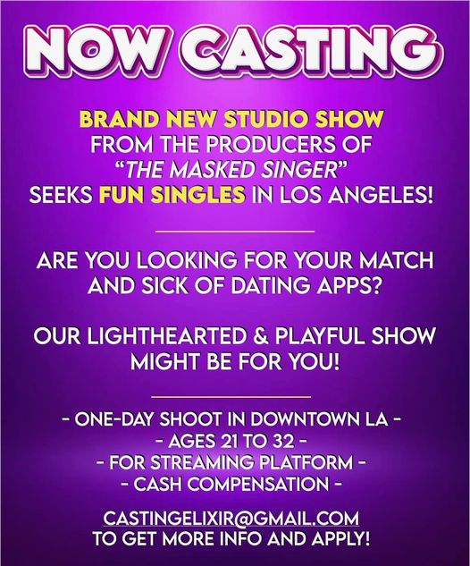 From the producers of “The Masked Singer,” comes a brand-new, playful, and lighthearted dating show that takes a fresh spin on romance! We’re looking for singles in Los Angeles to join us for a one-day shoot in Downtown LA, where you’ll be part of a unique social experiment designed to spark connections in a whole new way.
