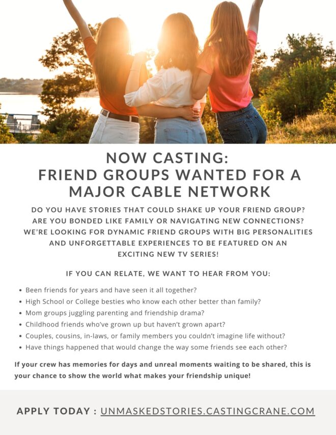 A major cable network is seeking vibrant friend groups with big personalities and memorable stories to feature on an exciting new series! Whether you’ve been inseparable for years or are just forming fresh bonds, They’re looking for friendships that feel like family and are packed with unique experiences.