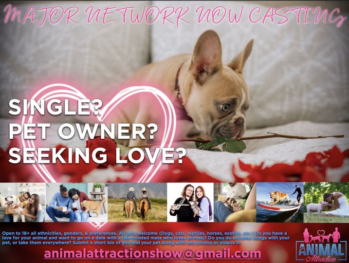 Casting a new reality dating show for pet owners looking for love. Open to 18+ all ethnicities, genders, & preferences. All pets welcome (Dogs, cats, reptiles, horses, exotics, etc.) Do you have a love for your animal and want to go on a date with a likeminded mate who loves animals?