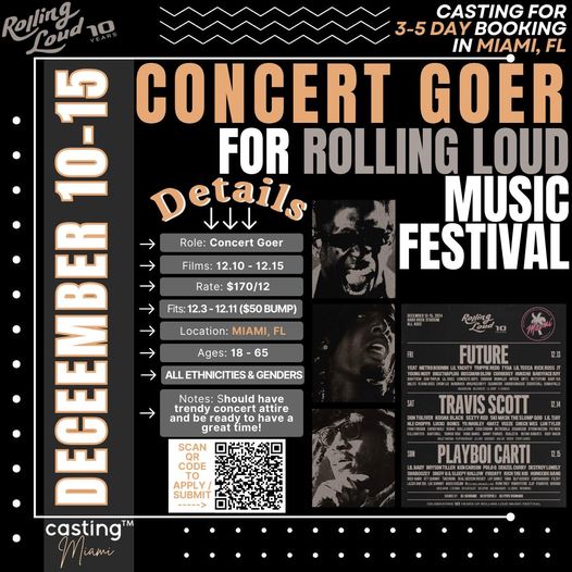 The Rolling Loud festival will be held at The Hard Rock Stadium December 13th to 15th, yet, the casting notice is for December 10th to 15th. So, there may be some other scenes filming that are outside of the actual festival that you may also be a part of.