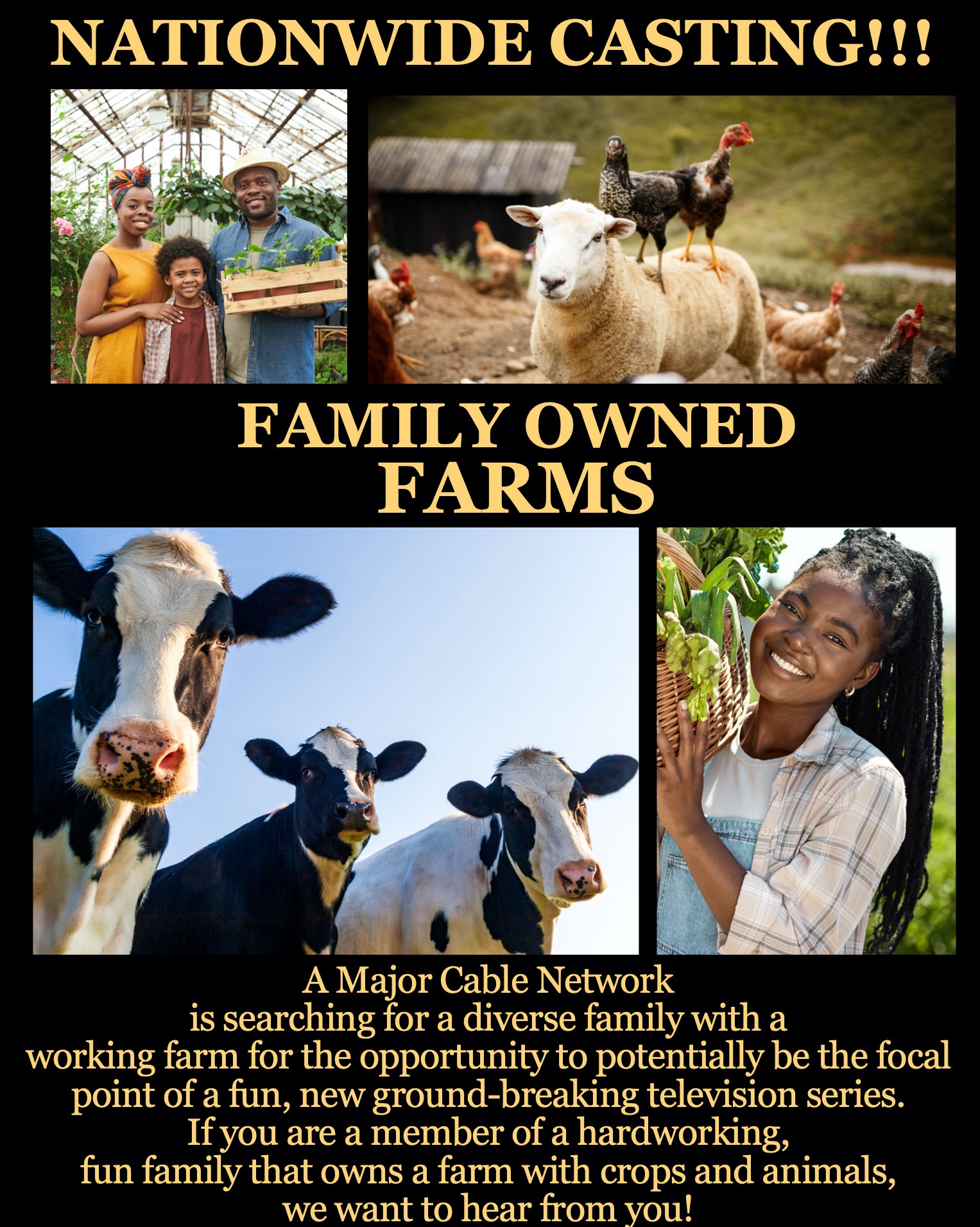 A Major Cable Network is searching for a diverse family with a working farm for the opportunity to potentially be the focal point of a fun, new ground-breaking television series. If you are a member of a hardworking, fun family that owns a farm with crops and animals, we want to hear from you!