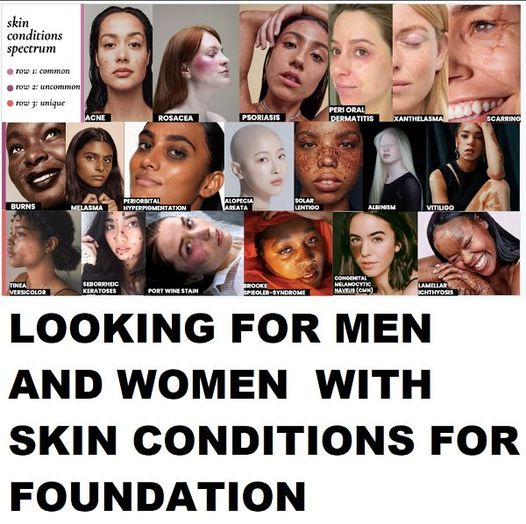 We are searching for individuals, ages 18 to 80, who live with visible skin conditions to participate in a unique and inclusive project. If you have a skin condition such as acne, rosacea, burns, melasma, alopecia, vitiligo, or any other condition that affects your skin, we want to hear from you.