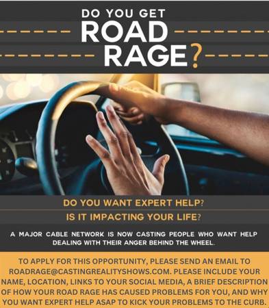 PAID OPPORTUNITY: A MAJOR CABLE NETWORK IS LOOKING FOR PEOPLE WITH ROAD RAGE WHO NEED HELP KICKING THEIR ANGER BEHIND THE WHEEL!