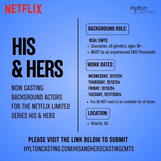 Hylton Casting is currently casting the experienced EMTs to work as background actors on the Netflix Limited Series His & Hers in scenes filming on Wednesday, 12/11/24, Thursday, 12/12/24, Friday, 12/13/24, and/or Tuesday, 12/17/24 in Atlanta, GA. You do not need to be available for all filming dates.