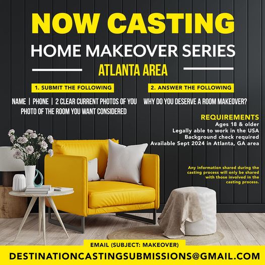 We are now casting for an exciting new home makeover series in Atlanta! If you’re 18 or older and legally able to work in the USA, this is your chance to have a professional design team give your room the makeover it deserves.