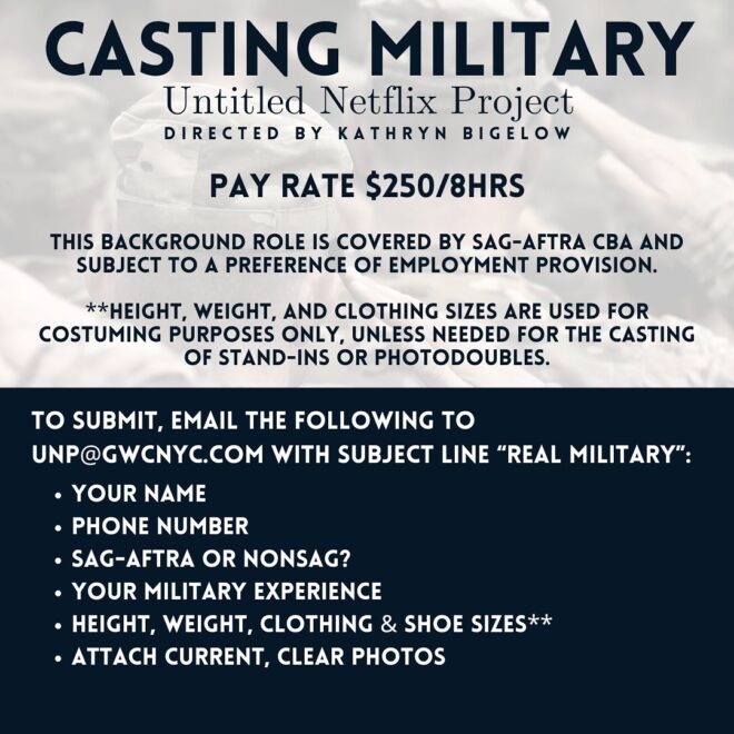 Academy award winning director Kathryn Bigelow (The Hurt Locker) is working on a new movie for Netflix. The Netflix feature will be filming scenes in the New Jersey area and the productions extra’s casting directors, GWCI, are seeking NJ area locals who are real military and have actual experience as military personnel.