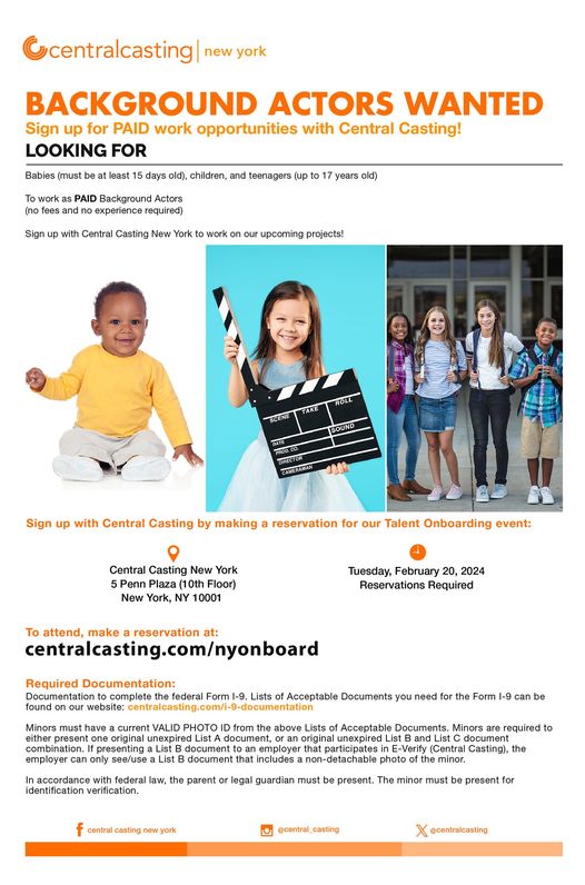 Sign up with Central Casting by making a reservation for our Talent Onboarding event: