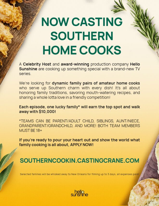 A new cooking competition TV show is casting teams of two family members who are talented home cooks specializing in Southern-style or Southern-fusion dishes. The show, being cast by Casting Duo (the team behind “Hell’s Kitchen” and “Project Runway“), will film in New Orleans, though auditions are open nationwide. Travel, lodging, and meals will be covered for those selected to participate. In each episode, the home cook duos will compete for a chance to win $10,000. This is an exciting opportunity for Southern home cooks to showcase their skills on national television!