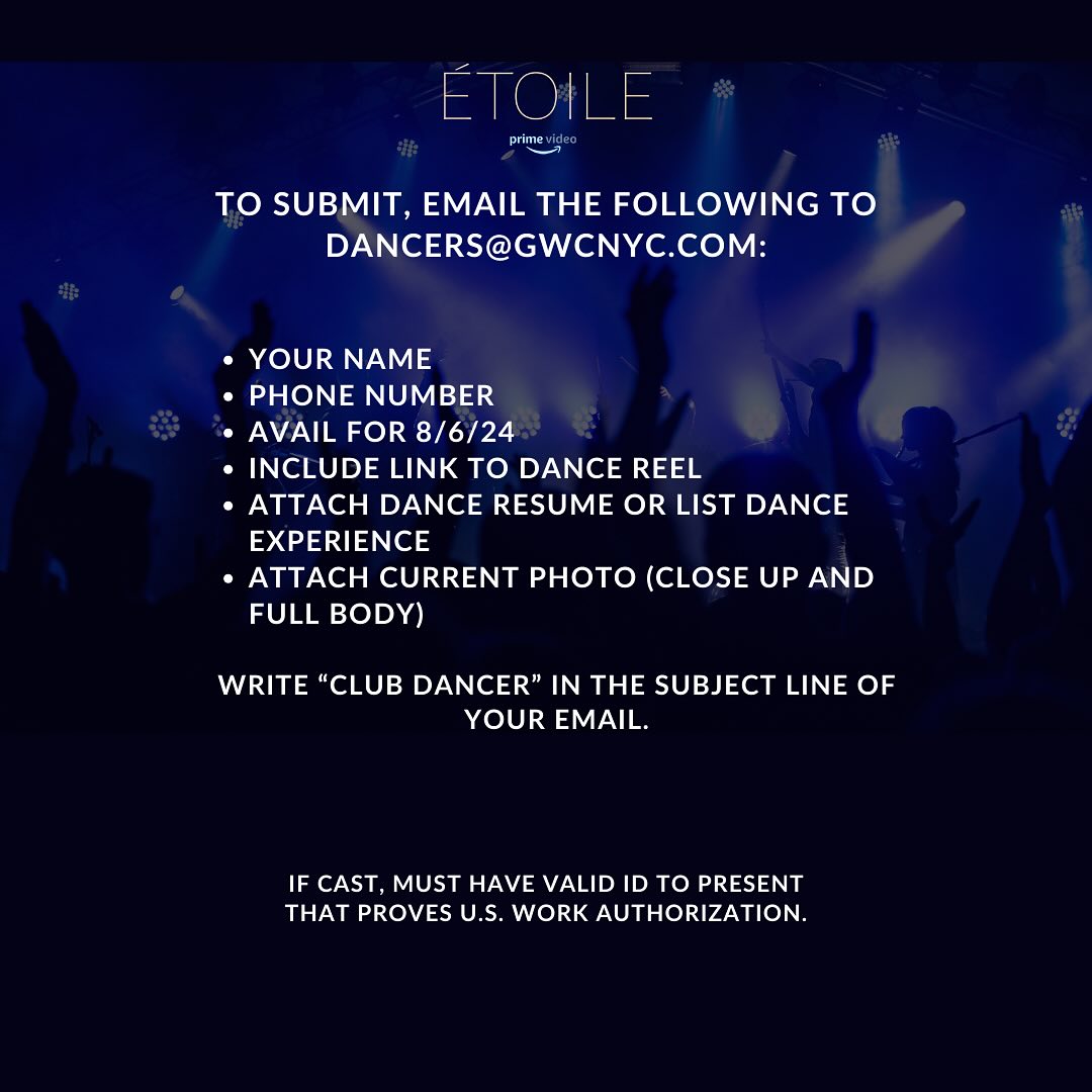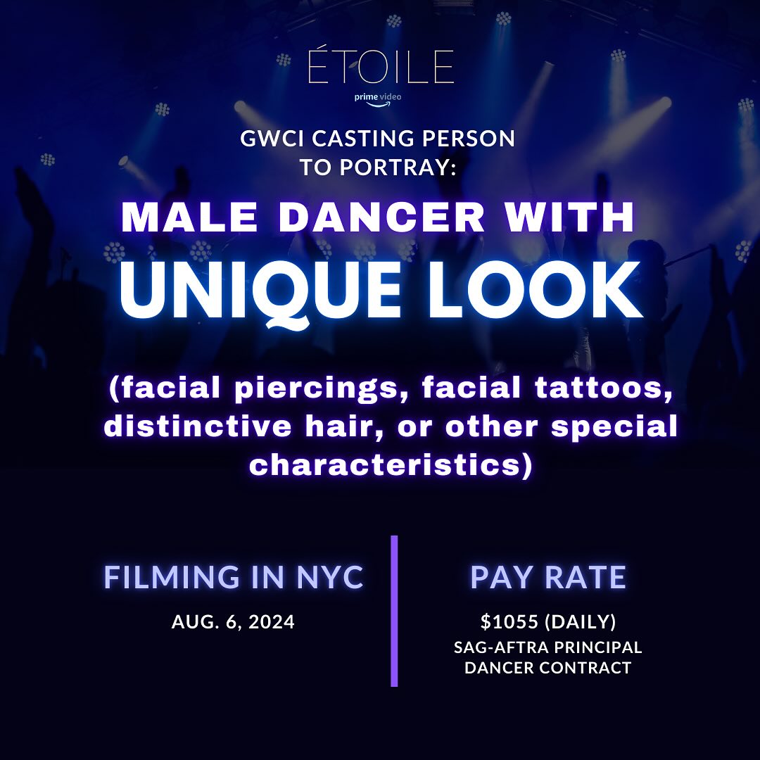 GWCI seeking person to play a male dancer with unique look for dance club scene filming on 8/6 in NYC for amazon series etoile – dancers – dancer casting Email photos, dance resume, dance reel, name and phone number to dancers@gwcnyc.com