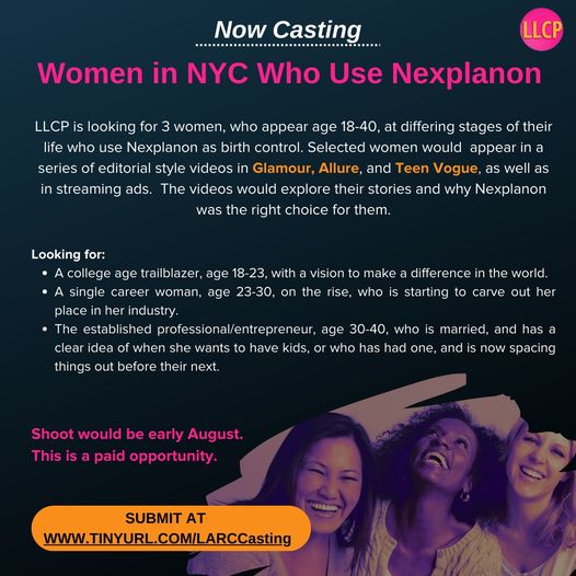 LLCP is looking for 3 women, who appear age 18-40, at differing stages of their life who use Nexplanon as birth control. Selected women would appear in a series of editorial style videos in Glamour, Allure, and Teen Vogue, as well as in streaming ads. The videos would explore their stories and why Nexplanon was the right choice for them.