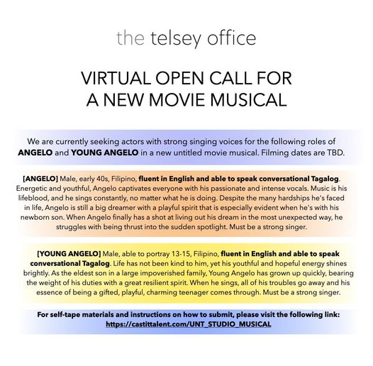 Telsey, The casting directors who recently had online auditions for the Disney movie, Moana, are working on another musical film. The name of the musical has not been disclosed in the movie audition notice. There are some very specific requirements. This movie audition is looking for a teen and an adult who are both fluent in Tagalog and English to fill the roles.