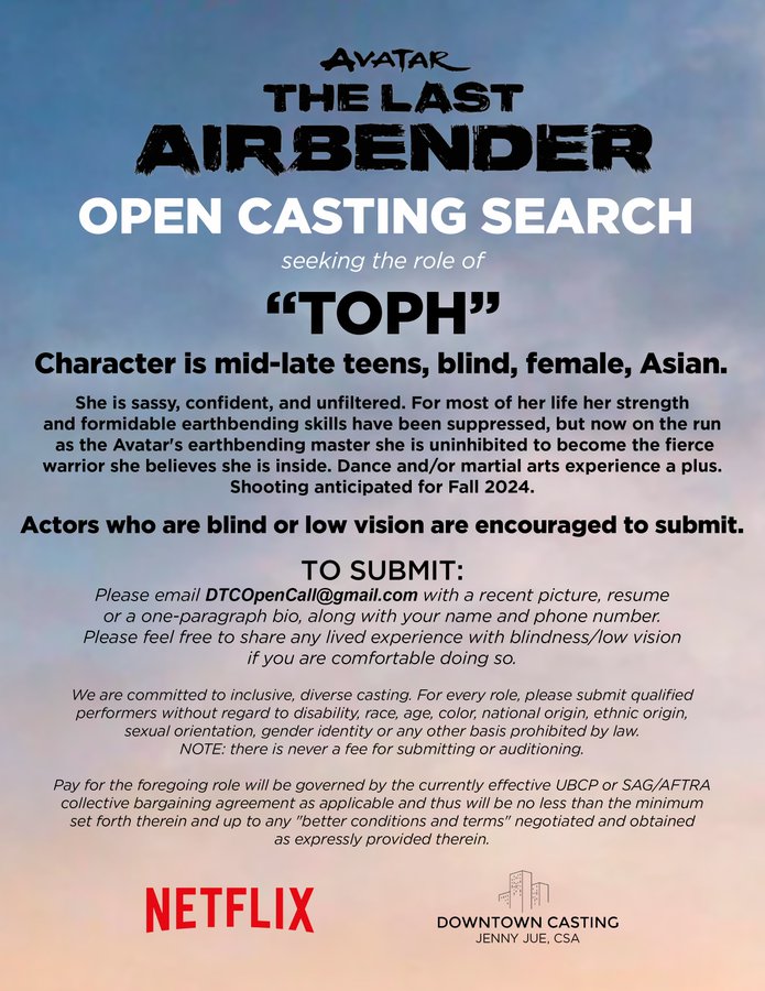 Netflix’s Avatar: The Last Airbender is holding an open casting search for the character “Toph.” – They are seeking a female actor of Asian descent, in her mid-to-late teens, who is blind. Toph is described as sassy, confident, and unfiltered.