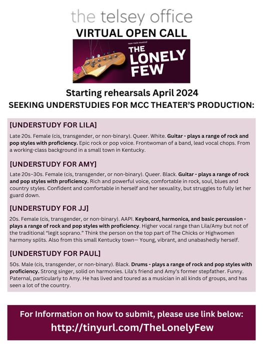 Seeking New York-based musician/actors for understudies in MCC Theater’s production of THE LONELY FEW!